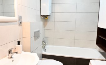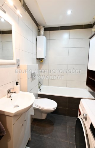 W łazience znajduje się wanna oraz na wyposażeniu pozostaje pralko-suszarka.