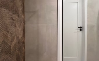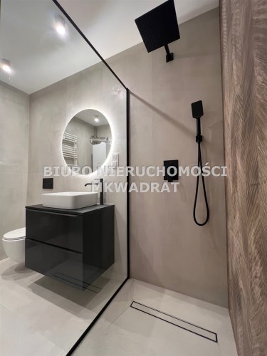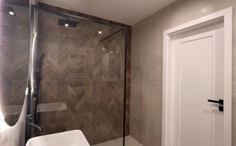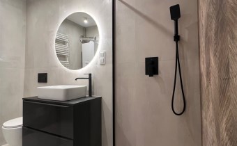 Stylowa i funkcjonalna łazienka wyposażona w nowoczesną kabinę prysznicową, wykończona w aktualnych trendach.