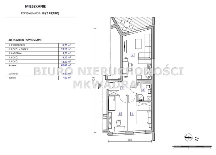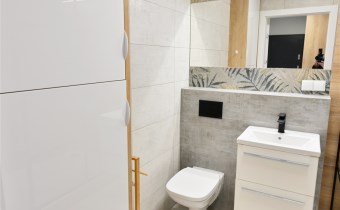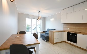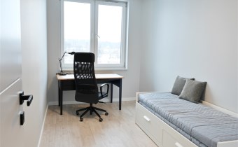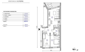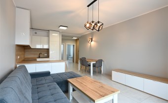 Mieszkanie składa się z dwóch sypialni, salonu połączonego z kuchnią, przedpokoju oraz łazienki. Z salonu jest wyjście na duży balkon o powierzchni aż 7,60 m2.