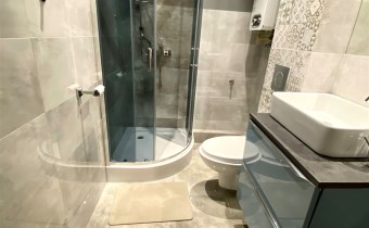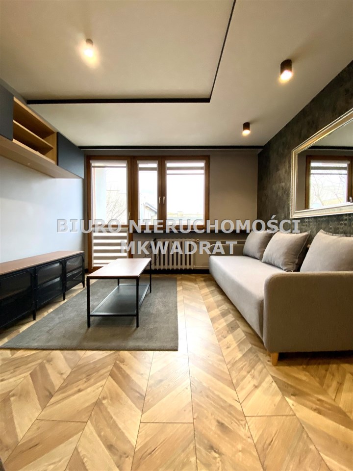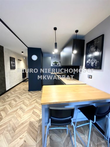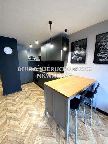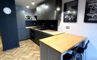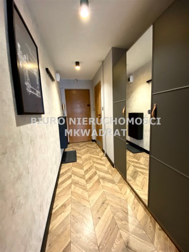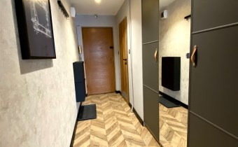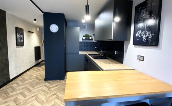 W salonie znajduje się kanapa, stolik kawowy, szafka pod TV oraz regał wiszący. Kuchnia w pełni umeblowana, wyposażona w płytę indukcyjną, piekarnik, lodówko-zamrażalnik, pralkę, okap oraz zlewozmywak z baterią. Łazienka w pełni wykafelkowana z kabiną prysznicową. W przedpokoju znajduje się pojemna szafa.