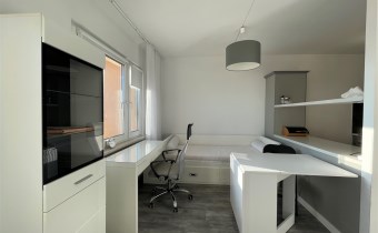 - salon z wydzieloną częścią sypialnianą oraz balkonem - rozkładana kanapa, fotel, komoda, witryna, łóżko, biurko