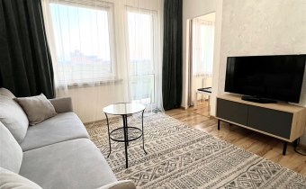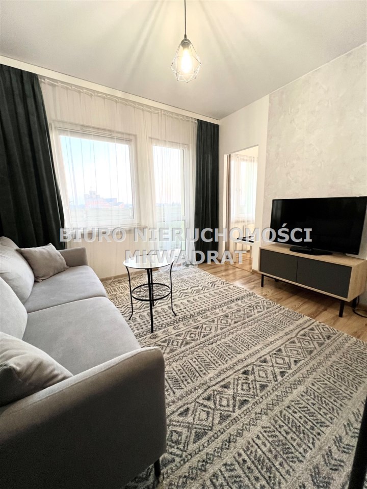 Salon z wyjściem na balkon, wyposażony w kanapę z funkcją spania, stolik kawowy, szafkę pod TV, stół z dwoma krzesłami. Na balkonie znajduje się zestaw wypoczynkowy do dyspozycji najemcy. Sypialnia wyposażona w łóżko małżeńskie oraz dużą szafę z lustrem. Kuchnia wyposażona w zabudowę meblową, lodówko zamrażalnik, piekarnik z płytą gazową oraz zmywarkę. Łazienka w pełni wykafelkowana, wyposażona w kabinę prysznicową oraz pralkę. W przedpokoju znajduje się duża szafa oraz komoda.