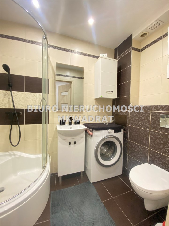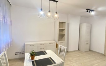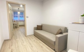 Salon w pełni umeblowany, wyposażony w komodę, witrynę oraz stół z krzesłami. Sypialnia z wyjściem na balkon wyposażona w komodę oraz rozkładaną kanapę. Oddzielna kuchnia w pełni wyposażona w zabudowę meblową, płytę gazową, piekarnik, lodówko-zamrażalnik. Łazienka z kabiną prysznicową cała wykafelkowana, wyposażona w pralkę.