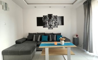 - salon wyposażony w kanapę, stolik kawowy oraz komodę