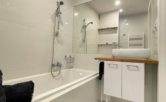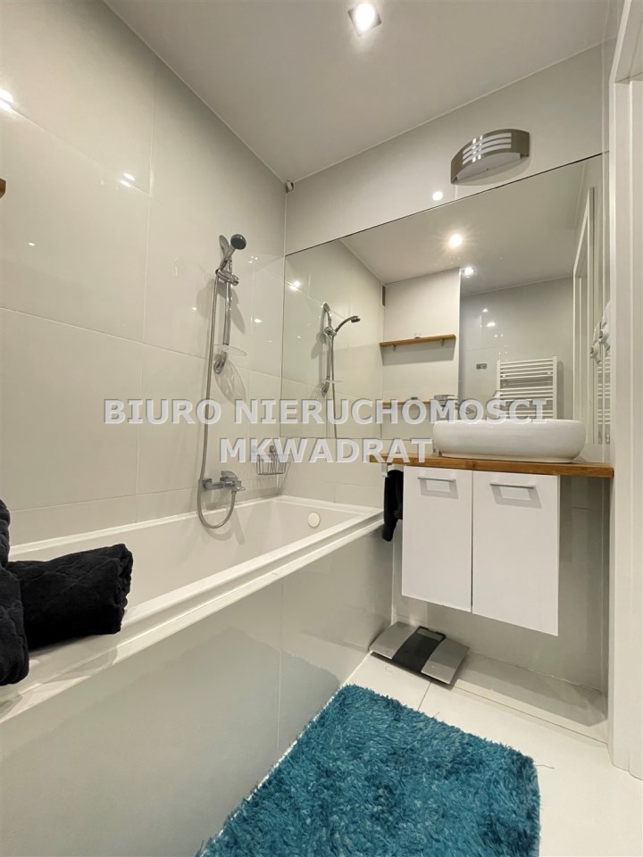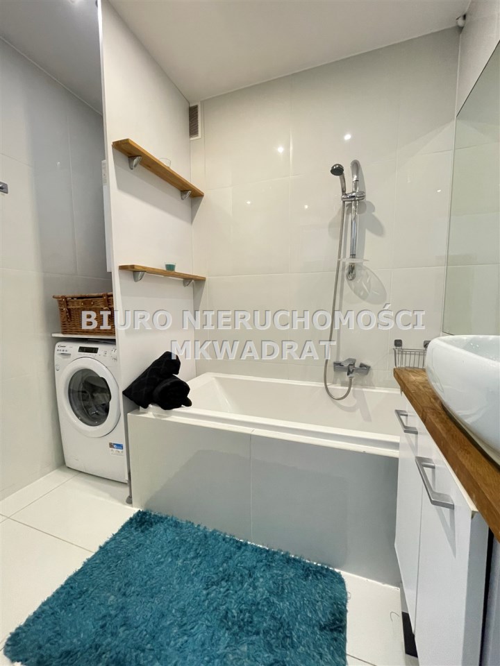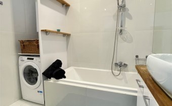 - łazienka wyposażona w wannę oraz pralkę