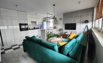- salon z aneksem kuchennym - w peÅ‚ni wyposażona kuchnia w zabudowÄ™ meblowÄ… oraz sprzÄ™ty AGD, salon wyposażony jest w dużą kanapÄ™, stolik RTV, stolik kawowy oraz stół z krzesÅ‚amiÂ